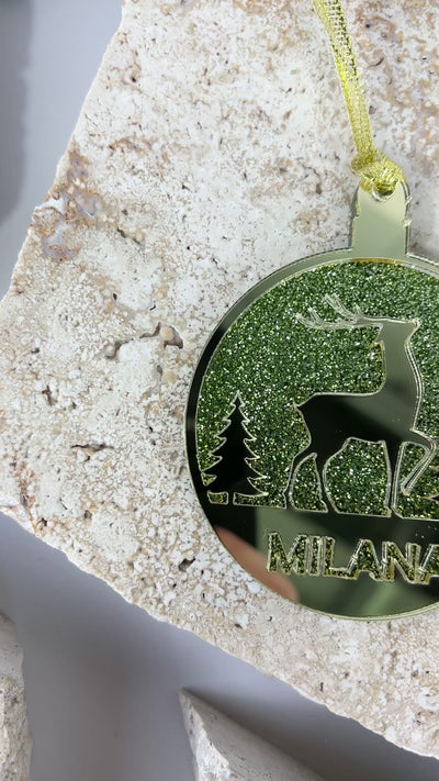 Capture the wonder of the holiday season with our enchanted reindeer Christmas bauble. This charming ornament features a beautifully detailed reindeer silhouette set against a sparkling, wintery background. Personalised with a name of your choice, this bauble brings a touch of magic to your Christmas tree, making it a perfect gift for loved ones or a special addition to your own holiday decor. Crafted from acrylic, the bauble is both durable and lightweight, ensuring it hangs gracefully on any branch. The enchanting design evokes the serene beauty of a snowy forest, making it a timeless keepsake for years to come.