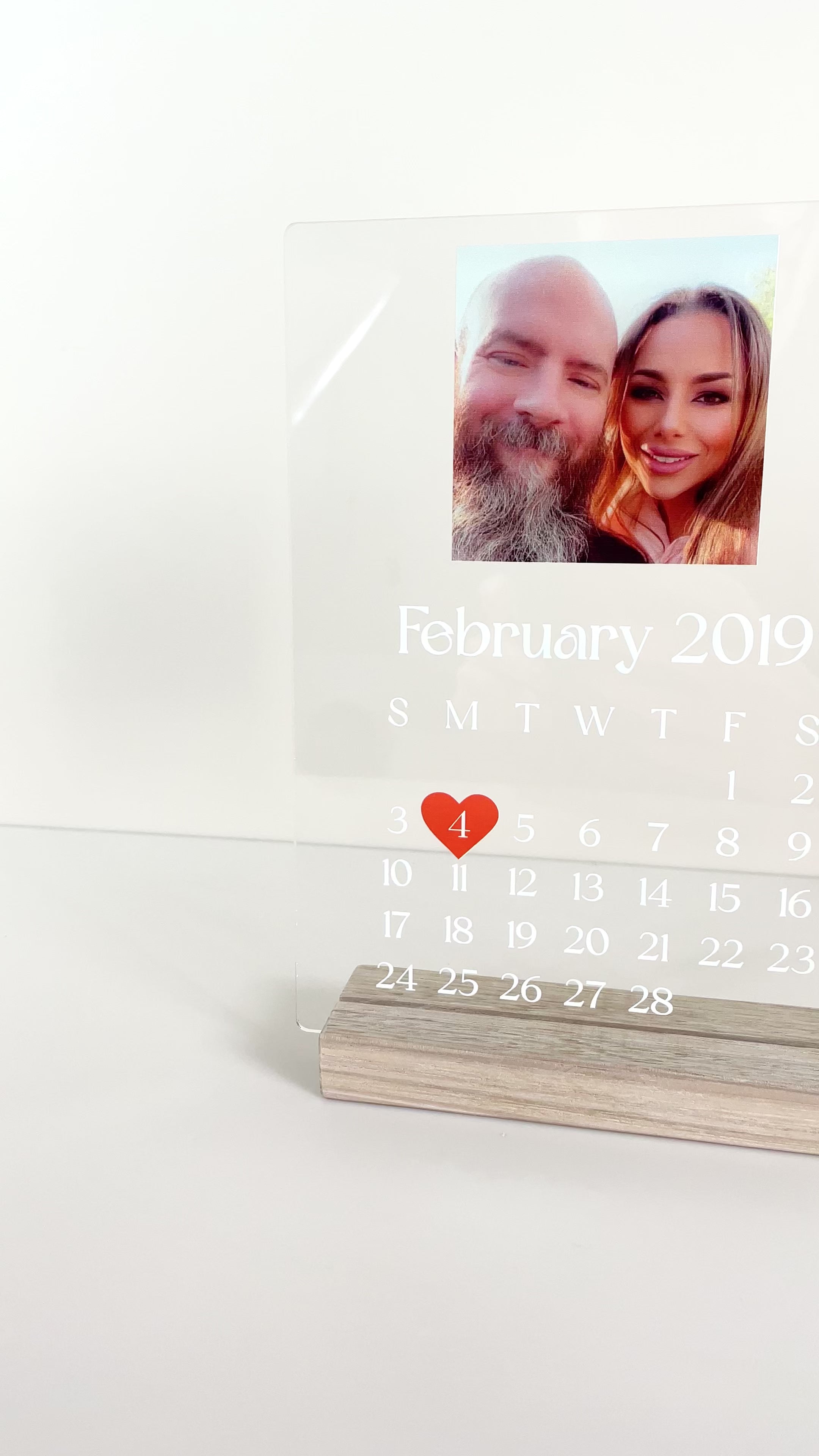 Commemorate a momentous occasion with our Special date photo display. This elegant display combines a cherished photo with a calendar marking the date that holds special meaning to you, whether it's an anniversary, engagement, or another significant milestone. The minimalist design features a heart symbol highlighting the special day, making it a beautiful keepsake to celebrate your love and memories. Crafted from high-quality acrylic, this display is not only a thoughtful gift but also a stylish addition to your home décor. Perfect for anniversaries, Valentine’s Day, or as a personalised gift for a loved one, this display captures the essence of your most treasured moments.